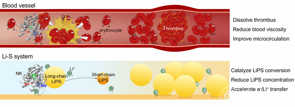 近日,受纳豆激酶(NK)溶解血栓和改善血液微循环功能的启发,我校杨植教授、杨硕副教授团队与中国科学技术大学江俊教授团队联合开发了一种高效的多硫离子转化仿生酶用于碳纳米管负载硫正极——NK及其肽基模拟酶(丝氨酸-组氨酸-天冬氨酸三联体活性中心,Ser-His-Asp)。密度泛函理论计算、原位光谱和电化学分析,揭示了其独特的催化机制:天冬氨酸(Asp)强电负吸附固定LiPSs,丝氨酸(Ser)电子轴拉伸催化S-S键断裂,组氨酸(His)亲锂位点促进电荷/Li⁺传输。通过机器学习优化配方,该催化剂显著提升了贫电解液条件下的SRR动力学,实现高倍率容量(744 mAh g⁻¹,5 C)、长循环寿命(250圈容量衰减率0.096 %)和高面积容量(8.87 mAh cm⁻²,E/S=4 μL mg⁻¹)。这一研究结果从生物酶到电化学,跨界创新,重新定义了锂硫电池催化的未来。