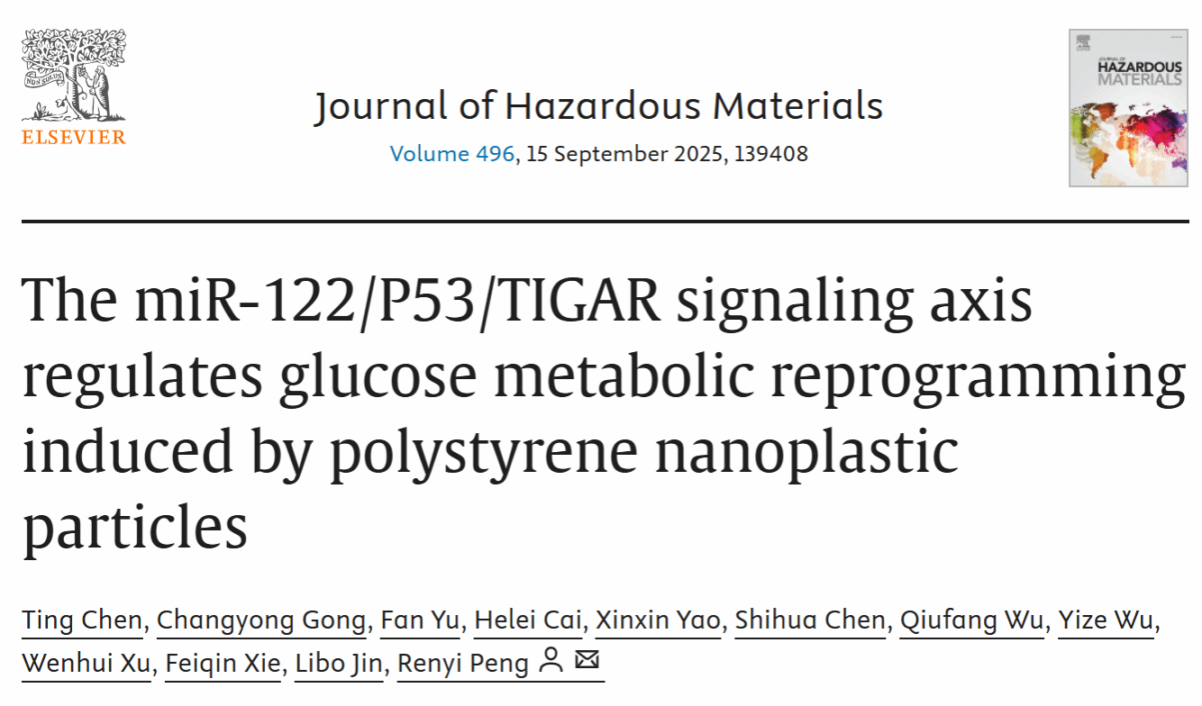 近日,LY体育·(国际)官方网站生命与环境科学学院彭仁义课题组在中科院一区期刊《Journal of Hazardous Materials》(IF=11.3)发表了题为“The miRNA-122/P53/TIGAR signaling axis regulates glucose metabolic reprogramming induced by polystyrene nanoplastic particles”最新研究。该研究聚焦聚苯乙烯纳米塑料(PS-NPs)污染这一全球性威胁,深入探究其通过靶向miRNA-122对糖代谢重编程的复杂影响机制。