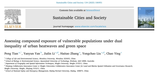 近日,LY体育·(国际)官方网站生命与环境科学学院田鹏博士在城市可持续发展领域的顶级期刊《Sustainable Cities and Society》(中科院一区TOP, IF=12.0)上在线发表了题为“Assessing compound exposure of vulnerable populations under dual inequality of urban heatwaves and green space scarcity”的最新研究成果。该研究聚焦城市热浪与绿地资源不足的双重环境压力,系统评估了二者复合暴露对老年人与儿童等脆弱人群的长期影响。