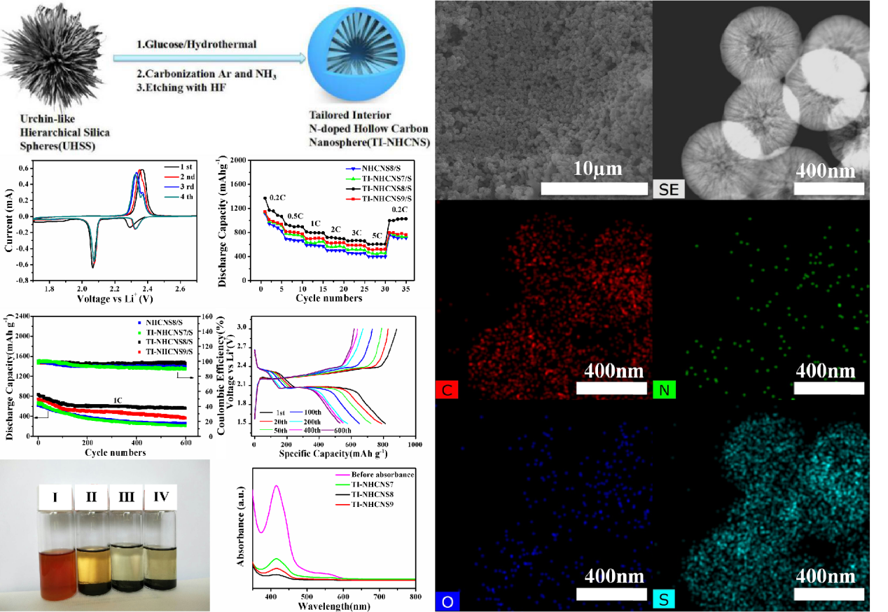 最近,我院2017级硕士研究生余志升等受课题组前期在分级多孔碳纳米片、花型碳纳米球设计合成及在锂硫电池应用基础研究工作(Adv. Energy Mater.2014, 4, 1301988、J. Mater. Chem. A, 2017, 5, 6245)的启发,创新提出一种中空碳球内部结构调控策略,设计合成了具有径向向内对齐的倒刺结构中空氮掺杂碳小球,作为硫主体表现出高的容量和出色的循环稳定性。通过碳球内部硫分布表征、锂离子扩散系数测定、多硫离子吸附试验、循环前后硫正极结构变化、循环后锂负极枝晶形成剖析,揭示其固硫机制,阐明性能提升原因为碳球内部碳刺可有效分散绝缘硫和硫化锂、刺刺之间空隙和空心结构有效缓冲硫体积变化造成应变、氮原子掺杂碳层高效抑制多硫离子流失。此外,该新型结构的碳球有望拓展到其它储能体系如钠磷、钾磷、硅基电池中应用。相关结果于近期发表在Angew. Chem. Int. Ed. 2020, 59, 6406. (https://onlinelibrary.wiley.com/doi/10.1002/ange.201914972) 上。