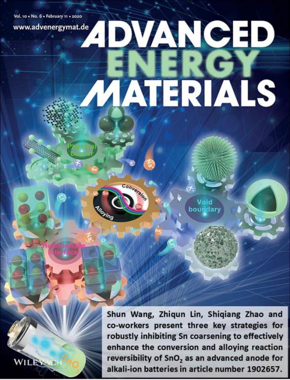 近日,国际能源顶级刊物《Advanced Energy Materials》将有关二氧化锡作为碱金属离子电池负极的综述论文“SnO2as Advanced Anode of Alkali-Ion Batteries: Inhibiting Sn Coarsening by Crafting Robust Physical Barriers, Void Boundaries, and Heterophase Interfaces for Superior Electrochemical Reaction Reversibility”选为期刊封面文章。该文章第一作者为赵世强博士,化材学院院长王舜教授与佐治亚理工学院林志群教授为通讯作者,LY体育·(国际)官方网站为第一通讯单位。