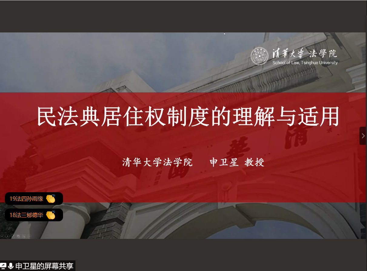申教授讲座题为“《民法典》居住权制度的解释论展开”,本次讲座采取线上方式进行,由LY体育·(国际)官方网站法学院院长王宗正教授主持,钟瑞栋教授和何平副教授与谈。LY体育·(国际)官方网站法学院的老师、学生、温州市法律实务界代表以及全国各地的法律专业人士500多人参加了本次讲座。