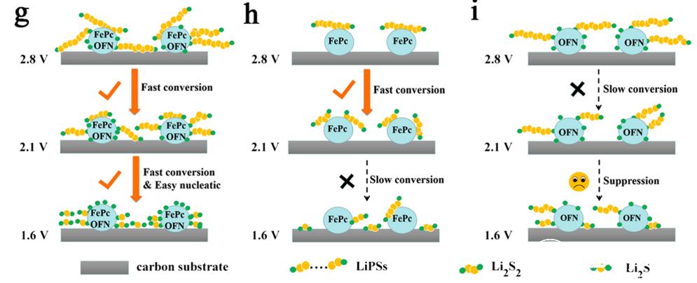 针对在锂硫电池中的硫转化过程中,需要经历多步连串反应,以及复杂的固-液-固多相转化特点,提出了“双控转化模”,分别使用人工模拟酶酞菁铁(FePc)和八氟萘(OFN)选择性地介导长链多硫化物转化(S8→Li2S4)和短链多硫化物转化(Li2S4→Li2S)。采用系列原位光谱、XPS及DFT等研究锂硫电池内部硫转化机制。结果表明,FePc通过Fe∙∙∙S的配位作用,对长链多硫化物起到了有效的锚定和剪切作用;而OFN则促进了与多硫化物的锂键作用,加速了Li2S的液-固成核和生长动力学。该双控系统促进了固-液-固硫转换反应能顺畅进行,显著提高了电池的电化学性能。