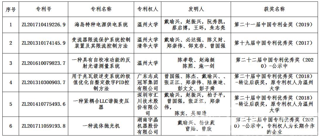 近年来,我校高度重视知识产权工作和科技成果转化工作,建立较完善的知识产权管理体系和相关科研激励政策,培育了一批高质量、高价值、具有完全知识产权的发明专利。电气与电子工程学院专利成果培育及科研成果转化工作尤其卓有成效。截止2021年5月,电气与电子工程学院教师以第一发明人获中国专利奖共6项。其中,以我校教师为第一发明人、LY体育·(国际)官方网站为专利权人的发明专利获专利奖3项,包括中国专利金奖1项、优秀奖2项(公示中1项);发明专利转让合作企业、以及合作企业联合开发产品申报发明专利后,获中国专利优秀奖3项。尤其是以戴瑜兴教授为第一发明人、LY体育·(国际)官方网站为专利权人的《海岛特种电源供电系统》获第二十一届中国专利金奖(2019年度),是温州市自中国专利奖设立以来首次获得该奖项,高校获得此殊荣的全国仅64项。