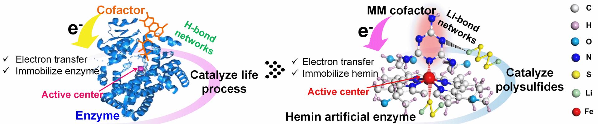 酶作为一种温和的绿色催化剂,在各种生理应激过程中展现出了惊人的催化能力。向大自然学习,让生命物质成为设计思想的源泉。近期,我校杨植教授团队在前期探究硫转化仿生人工酶的研究基础上(二硫苏糖醇硫转化剪切剂,ACS Nano 2017, 11, 2209, IF=15.9;血红素硫转化人工酶,Advanced Functional Materials 2020, 30,2003354,IF=18.8;硫转化仿生双控催化系统,ACS Nano2020, 14, 7538),由辅酶在生命系统中能促进提升酶催化活性和稳定性受到启发,从结构和功能的角度模拟天然酶,提出通过设计模拟辅因子,将其引入锂硫电池体系,构筑出了碳纳米管—血红素人工酶—三聚氰胺辅因子硫转化仿生催化系统。利用辅因子中的三聚氰胺多级富氮结构与Li相互作用形成的“多重锂键网络”以及该辅因子与人工酶的电子相互作用,赋予了人工酶更高的催化能力和稳定性,进而实现了锂硫电池在倍率和循环耐久性方面的大幅度提升。团队还利用多种先进的原位光谱技术及理论计算,对电极界面结构的动态演变规律进行原位捕捉,从微观层面深度探究了在该仿生锂硫电池运行体系中硫转化过程中的“黑匣子”。课题组率先发现并提出的“多重锂键网络”概念,为开发其它锂电池及电化学储能装置提供了重要的理论基础。