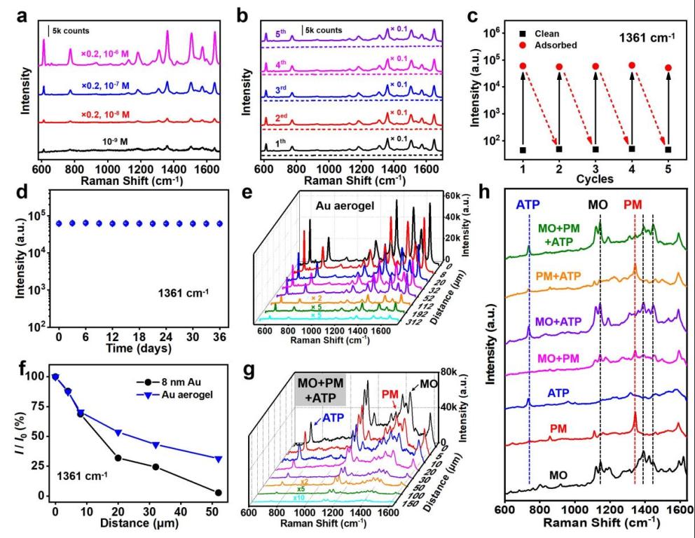 以LY体育·(国际)官方网站胡悦副教授、北京理工大学杜然教授、德累斯顿工业大学Alexander Eychmüller教授为首的国际团队在前期工作中,通过对金属气凝胶合成方法学的深入探索,开发了一系列可控制备方法,实现了金属凝胶的快速制备及其特征尺寸、比表面积、孔容等多种参数的大范围调控(Sci. Adv.2019, Nat. Commun.2020, Matter2020)。在此基础上,上述团队再次携手,以网络特征尺寸为5-100 nm的金气凝胶为例,从理论与实验两个角度系统探究了气凝胶基底的特征尺寸与SERS活性依赖性。通过对相关参数的优化,不仅获得了大对焦容差的SERS基底(>300 μm),更实现了对染料分子、农药和致癌物质的高灵敏度与多通道检测。