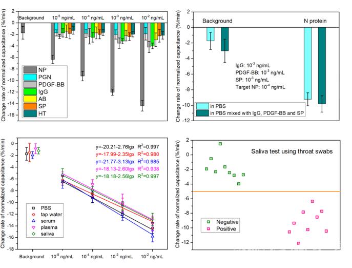 我校电气与电子工程学院张鉴教授课题组基于微流控富集和核酸适配体特异性识别机制,以病毒的核衣壳蛋白(N蛋白)为抗原,利用微加工传感器的pF级界面电容感应原理,实现了一种低成本、非标记、非测序的痕量新冠病毒标志物检测芯片及检测策略。N蛋白作为SARS-CoV-2的一种重要结构蛋白,在病毒RNA的组装和释放中起着关键作用,是一种理想的检测靶标。通常的抗原检测方法对痕量蛋白依赖额外的预富集装置及步骤,不易实现实时检测。课题组利用交流介电泳力驱动,在15秒内完成超痕量N蛋白的富集,同时巧妙利用界面电容变化率,在同一过程中完成传感信号读出。该传感器的检出限低至10-6ng/mL,较之大部分已报道结果低4个数量级,线性范围为(10−5~ 10−2)ng/mL,检测时间为15秒钟。课题组利用该传感器对血清、血浆、唾液、环境水等多种基质中的N蛋白进行了成功检测。