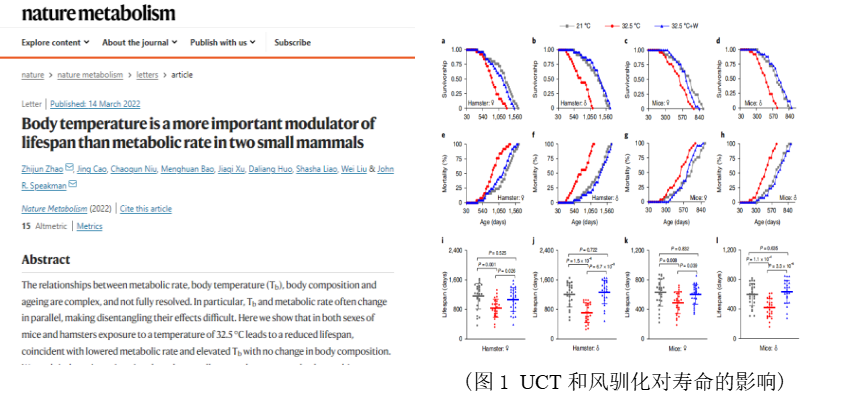 我校生环学院赵志军教授课题组联合中科院深圳先进技术研究院JohnRogerSpeakman教授团队在动物能量代谢与衰老和寿命的研究中取得新进展,以“Body temperature is a more important modulator of lifespan than metabolic rate in two small mammals”为题,于2022年3月15日在线发表于《Nature Metabolism》寿命可能与代谢率有关。对一些动物研究发现代谢率越高寿命越短,高代谢率可能导致自由基生成增加,对机体组织氧化损伤加剧,导致衰老加速,寿命变短。但也有一些研究表明,寿命与代谢率没有相关性,某些高代谢率的物种(例如鸟类)寿命比较长,而代谢率较低的物种(例如有袋类动物)寿命却较短。由此推测,代谢率高低与寿命长短的相关性可能是在个体水平,而非种间水平。限食条件下动物不仅有较低的代谢率,也有较低的体温。降低体温主要通过降低代谢率来实现的,二者密切相关,因此低代谢率和低体温可能都是影响衰老和寿命的重要因素。但由于代谢率的变化通常伴随着体温的变化,故此难以区分二者单独对衰老和寿命的影响。