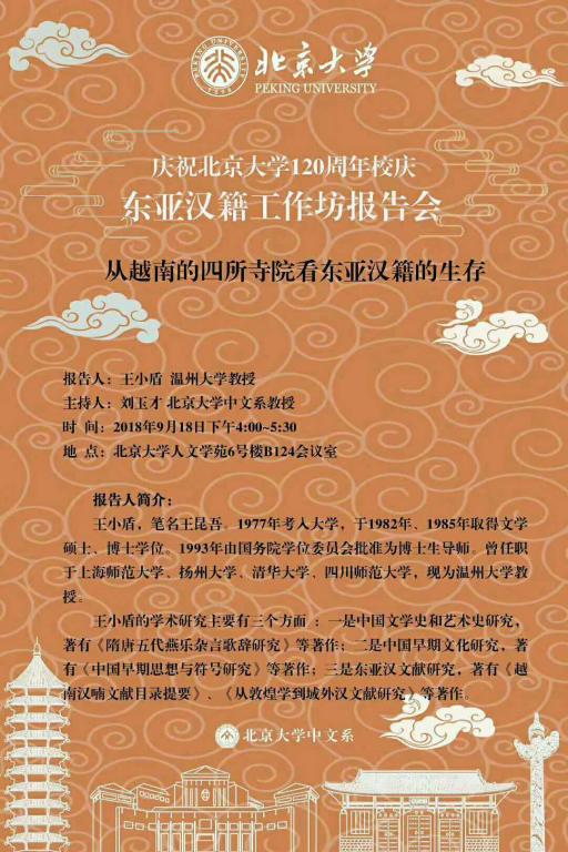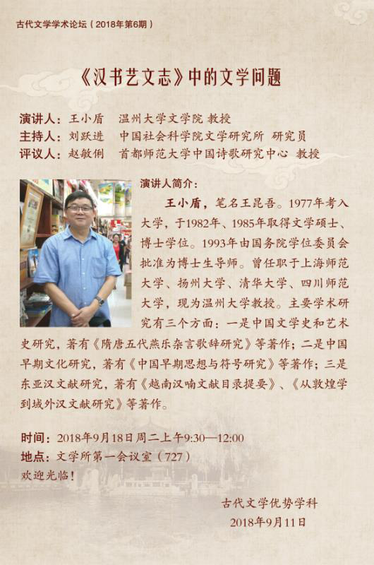 9月18日上午,LY体育·(国际)官方网站特聘教授王小盾在中国社会科学院文学所第一会议室主讲古代文学学术论坛第6期 《<汉书艺文志>中的文学问题》。下午,王小盾教授在北京大学人文学苑6号楼B124会议室作题为《从越南的四所寺院看东亚汉籍的生存》的主题报告。晚上,中国红楼梦学会常务理事饶道庆教授在北京的恭王府开讲《“正邪两赋”话宝玉》,这是北京青年报"青睐"线下活动携手恭王府举办"走进红楼梦中人——恭王府与《红楼梦》“主题系列讲座的第四场。