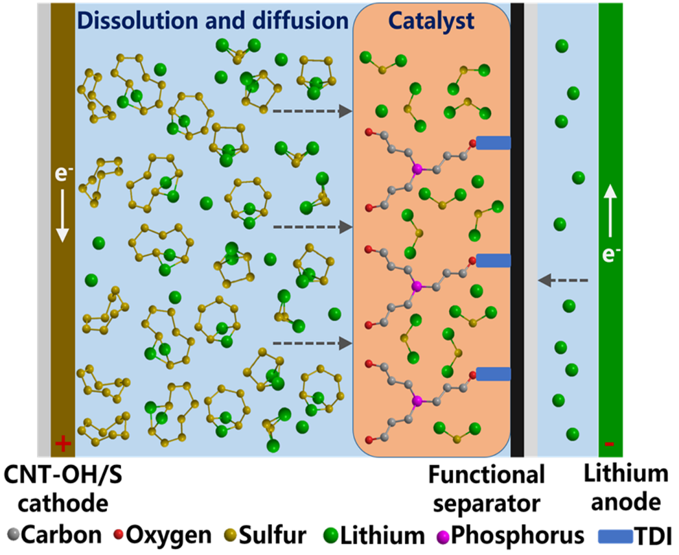近日,我校陈锡安教授课题组在国际顶级期刊《Angewandte Chemie International Edition》发表题为“Hydroxylated Multi-walled Carbon Nanotubes Covalently Modified with Tris(hydroxypropyl) Phosphine as a Functional Interlayer for Advanced Lithium-Sulfur Batteries”的论文。该工作开发了一种三(羟丙基)膦共价改性羟基化多壁碳纳米管作为先进锂硫电池的功能层。利用三(羟丙基)膦(THPP)作为锂硫电池功能插层中的活性物质,能够快速将液相多硫化锂(Li2Sn, 4≤n≤8)催化转化固相硫化锂(Li2S),从而有效抑制多硫化物穿梭效应。同时能够诱导锂负极表面形成稳定的固体电解液中间相(SEI)层,进而减少锂负极枝晶的形成。并揭示了有机小分子THPP催化多硫化物过程中形成的活性中间体,对锂硫电池中有机小分子催化多硫化物的作用机制提供了一个新的见解。