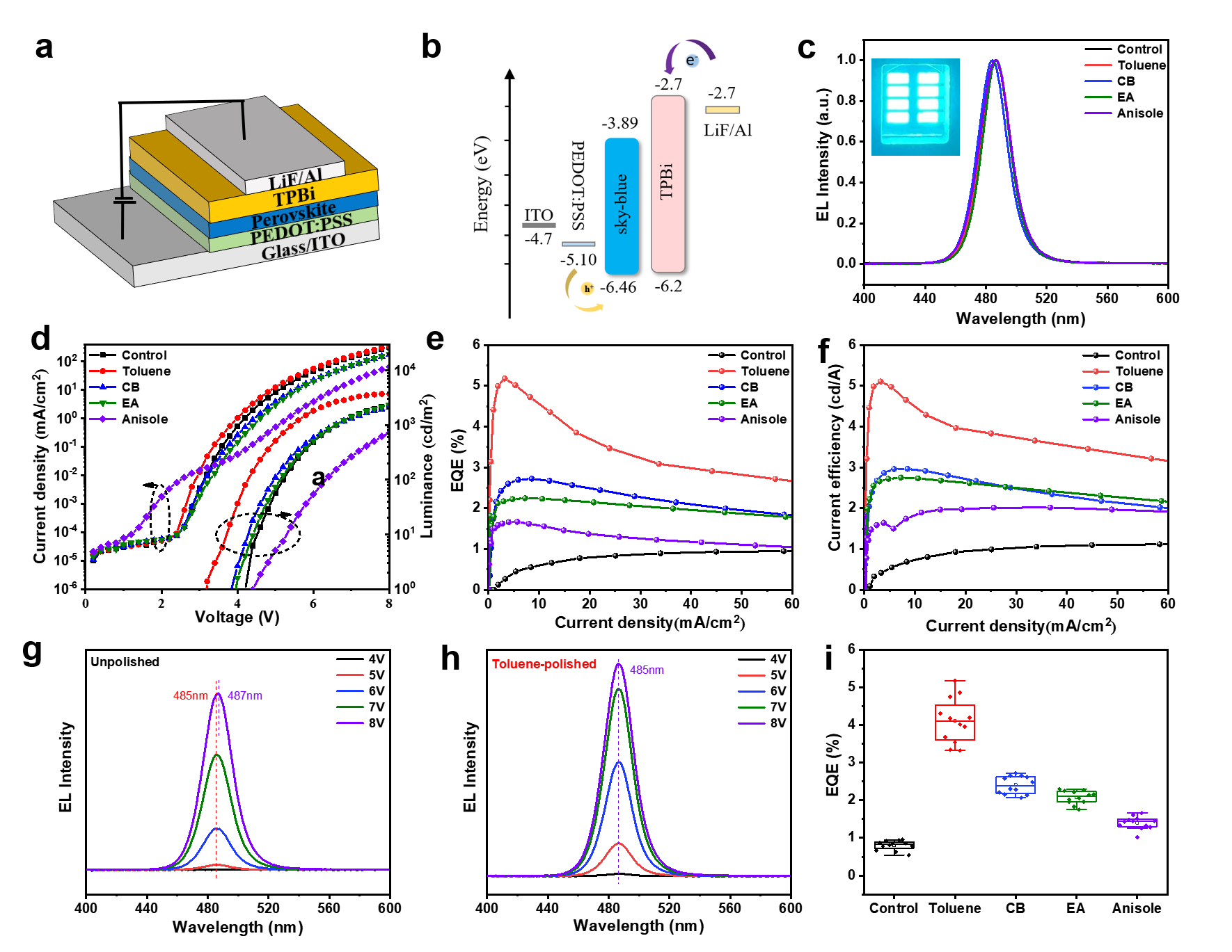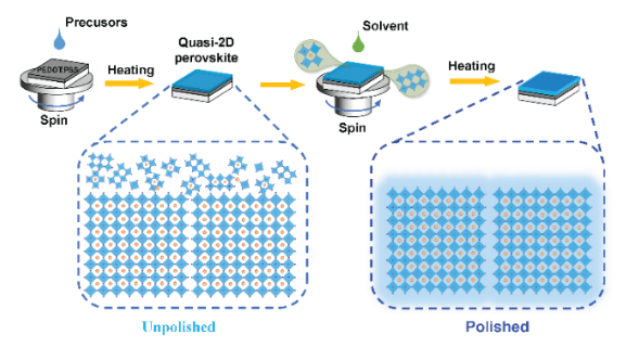 近日,LY体育·(国际)官方网站邹超课题组提出了一种溶剂抛光策略,在不影响载流子输运的前提下有效去除钙钛矿表面的富缺陷层,并有效减少非辐射复合中心n=1相的形成。通过系统研究抛光效果与溶剂极性的关联,确定甲苯溶剂能够在最大限度维持钙钛矿薄膜性质的基础上有效消除缺陷。研究中实现了高效的蓝光PeLED器件,在485 nm处的最大EQE为5.18 %,最高亮度为3737 cd m-2,启亮电压为3.2 V,分别比未抛光的PeLED器件(启亮电压:4.2 V)高出545 %和162 %。这项研究在不损失载流子输运效率的前提下为缺陷消除提供了一种新思路,以实现高效的蓝光PeLED。