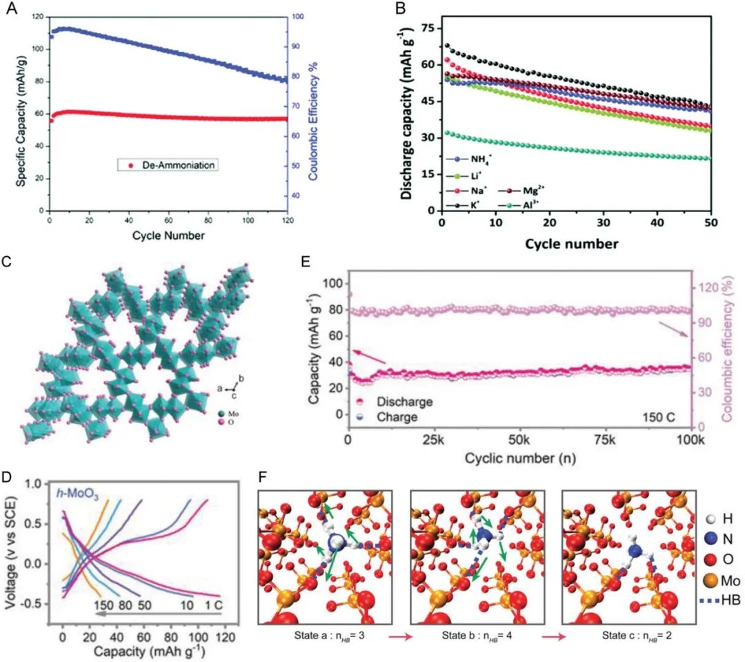 如图1 所示,与其他金属离子相比,作为电荷载流子的资源丰富的铵离子在物理化学性质方面表现出若干优势。首先,NH4+ 的摩尔质量仅为 18 g mol−1,其与那些金属离子相比是最轻的,甚至比 H3O+ 还要轻。此外,虽然它的离子半径很大,为 1.48 Å,但铵离子的水合离子尺寸最小,为 3.31 Å。因此,重量轻和水合离子尺寸小都有助于 NH4+ 离子在水系电解质中快速扩散。此外,与质子或水合氢离子相比,相对适中的 NH4+ 酸度有利于构建温和的酸性或中性电解质环境,该环境的析氢副反应较少,腐蚀性较小。最后,同样值得注意的是,NH4+呈四面体形状,具有很强的择优取向性,与金属离子的球形完全不同。在这种情况下,主体材料中的拓扑插层化学可能与球形金属离子电荷载流子不同,因此NH4+ 离子电池可能会带来揭示独特电化学性能和电池化学的机会。总体而言,研究水性 NH4+ 离子电池的可行性并揭示其潜在的非凡电池拓扑结合化学是非常有意义的。