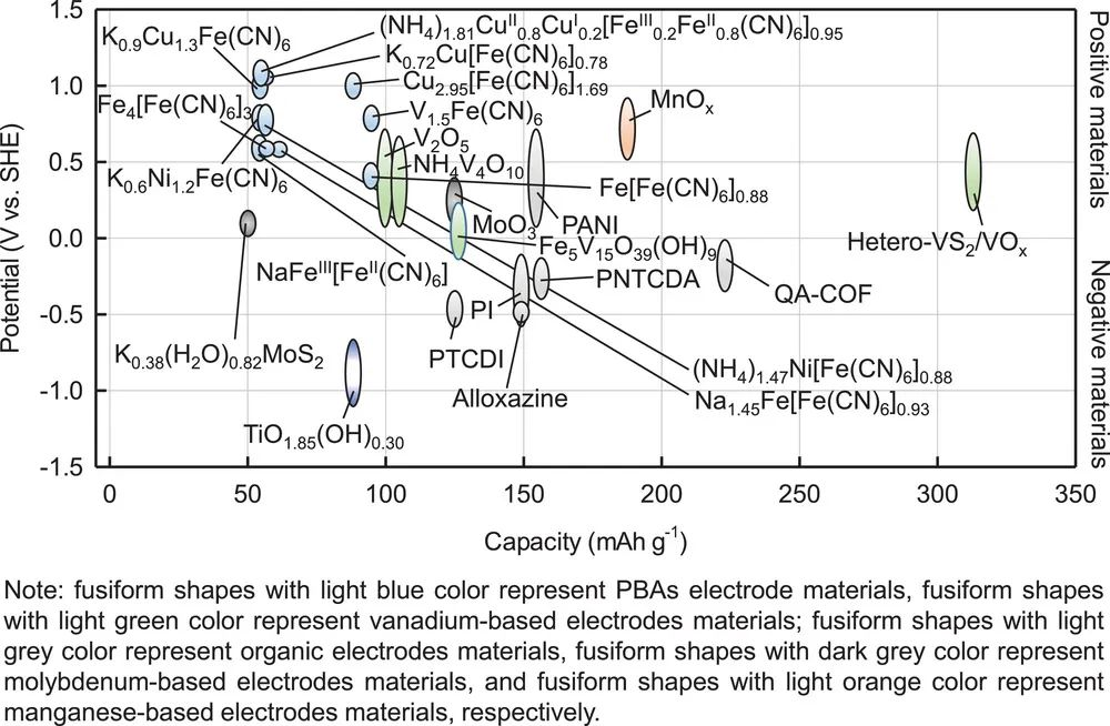 图3. 用于水系 AIB 的电极材料的电位和容量总结.