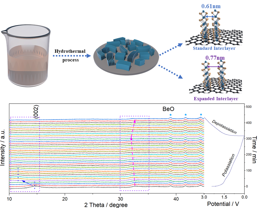 目前锂离子电池由于其高能量密度和优异的循环性能,被广泛的应用在各种电子电器中,但是受锂资源地球储量的限制,亟需寻求新的二次离子电池储存系统。近年来,相比于锂量存储而言,钾由于其更高的存量和更低廉的价格的而备受研究人员的关注。但是,较大钾离子半径限制了电极材料在钾离子电池中的电化学性能,因此,改善和提高二维过渡金属硫族化物(TMD)的电化学反应动力学和固有的较差的导电性对于开发高性能TMD电极材料和新一代能量储存系统具有重要意义。二硫化铼(ReS2),一种具有特殊性质的TMD材料,有着更弱的范德华层间作用力和较大的层间距,作为钾离子电池(PIB)负极材料表现出优异的性能。