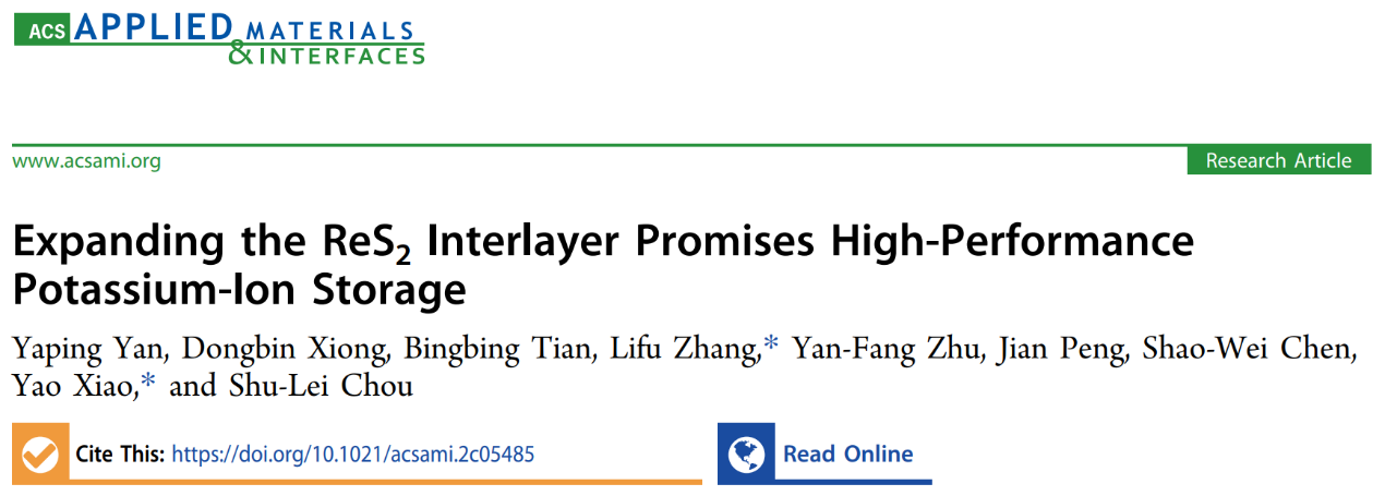 然而,目前报道的ReS2电极材料表现出的较差的动力学离子扩散和循环稳定性,尤其是在高电流密度下的电化学性能。为了解决上述关键核心问题,近日,我校化材学院碳中和技术创新研究院肖遥团队在国际权威期刊《ACS Applied Materials & Interfaces》(https://pubs.acs.org/doi/abs/10.1021/acsami.2c05485)上发表题为“Expanding the ReS2 Interlayer Promises High-Performance Potassium-ion Storage”的研究论文。本文利用二维层状材料的特点,采用二维材料层间距扩大的策略,通过简单的水热法,在还原氧化石墨烯(rGO)表面上合成了扩层的ReS2纳米片。所制备的ReS2纳米片的层间距为~ 0.77 nm,远大于扩层前的0.61 nm。采用原位XRD技术研究了ReS2在钾离子电池中的离子存储机制,揭示了钾离子在扩层ReS2中嵌入和转换两种混合的模式。扩层的纳米复合材料在0.05、0.2和1.0 A/g电流密度下表现出432.5、316.5和241 mAh/g的高比容量,并在1A/g的电流密度下,表现出优异的可逆性。总体而言,这种材料局域化学策略也为其他材料的开发应用提供了新的借鉴。