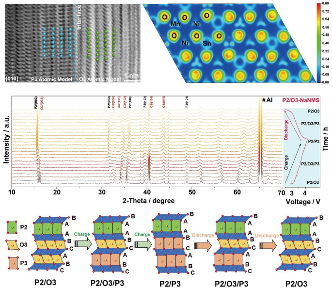 图1.P2/O3-NaNMS异质结构正极材料的原子结构表征,理论计算以及充放电过程中晶体结构演变示意图