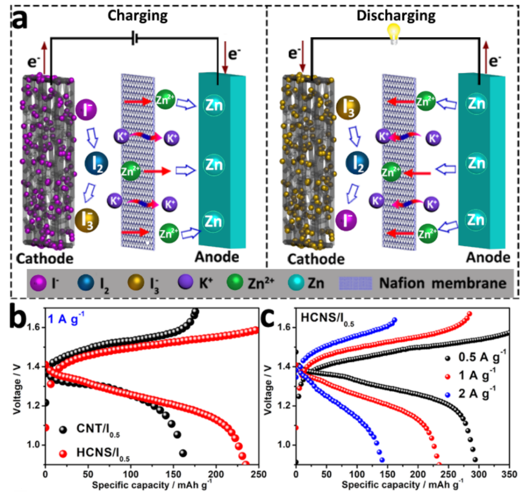 近日,我校钱金杰课题组通过对In-MOF热裂解过程中配体脱羧和氧化铟纳米颗粒氧化还原反应的调控,进而形成的液态金属铟通过熔聚和重力作用从碳纳米内腔中聚集流出形成空腔,从而获得中空结构的多孔碳材料(HCNS)。这种纳米秸秆形状的HCNS催化剂具有远高于CNTs的电化学交换能力。HCNS具有更多的电荷活性位点、短而快速的电子和离子传输途径,以其独特的内腔和管壁上相互连接的多孔结构,成功获得新一代高性能理想正极材料。其中,HCNS/I0.5展现出优于商业CNTs材料的高比容量(484.9 mAh g-1@1 A g-1)和较好的倍率性能。在此基础上组装的锌碘电池在1 A g-1时提供了246.6 mAh g-1的高容量,保证了电解液中碘物质的吸附和溶解平衡,极大地提高了该电池的倍率和循环性能,从而获得了优异的容量保持率。