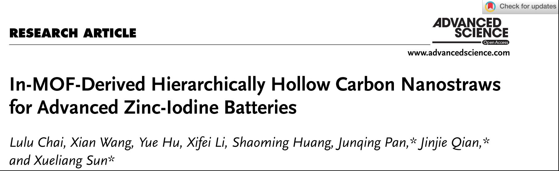 因此,本研究工作为锌离子电池和锂离子电池等高比能量二次电池的未来发展提供一种通用多孔的中空碳材料载体的可控制备策略。这一研究结果以“In-MOF-Derived Hierarchically Hollow Carbon Nanostraws for Advanced Zinc-Iodine Batteries”为题发表在《Advanced Science》,LY体育·(国际)官方网站作为第一通讯单位,2020届研究生柴路路为第一作者,LY体育·(国际)官方网站钱金杰副教授、北京化工大学潘军青教授和加拿大西安大略大学孙学良院士为共同通讯作者,该工作得到国家自然科学基金(21601137)、中国科学院结构化学国家重点实验室(20190008)、温州市基础科学研究项目(G20190007,ZG2017027)、LY体育·(国际)官方网站研究生科研基金(316202001022)的资助。
