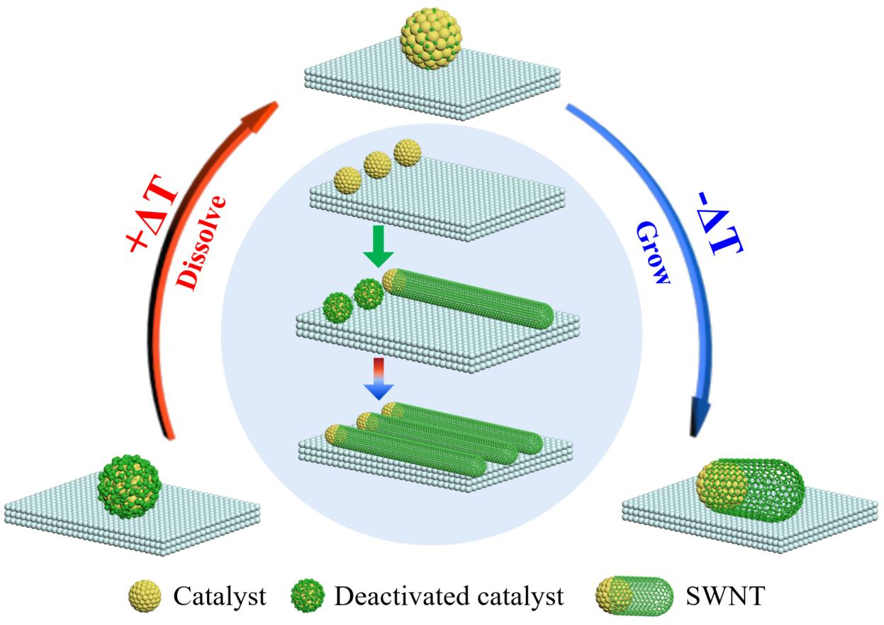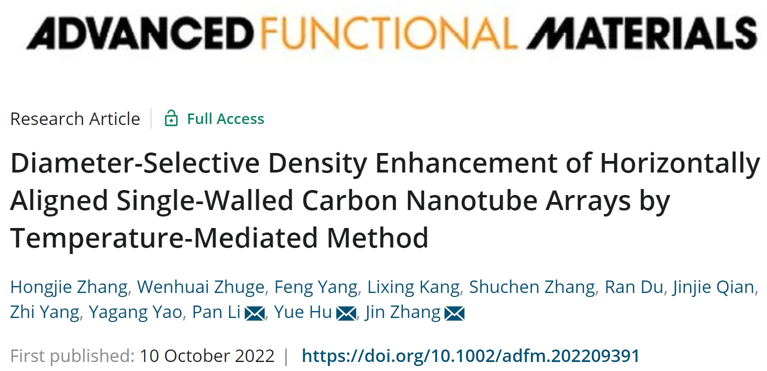 近日我校化材学院胡悦特聘教授团队联合南京邮电大学李盼副教授、北京大学张锦教授在控制制备高密度单壁碳纳米管(SWNT)方面取得新进展,开发了一种简单且新颖的温度扰动策略以制备具有管径选择性的高密度SWNT阵列,为SWNT在纳电子器件方面的提供了理想平台。相关成果以标题“Diameter-Selective Density Enhancement of Horizontally Aligned Single-Walled Carbon Nanotube Arrays by Temperature-Mediated Method”(DOI:10.1002/adfm.202209391)发表在Advanced Functional Materials。该工作通过调节温度对金属催化剂容碳量进行调控,再活化具有特定尺寸的因被碳包覆而失活的催化剂,使其继续催化生长特定管径的SWNT。最终使得在石英基底上获得的SWNT阵列的密度增加了三倍以上,且管径分布控制在2纳米左右。并通过环境透射电子显微镜对催化剂再活化过程进行原位研究,为催化剂效率的提高提供了关键性的见解。使用获得的SWNT阵列制作场效应晶体管器件,该器件表现出非常优秀的载流子迁移能力,表明所获得的SWNT阵列在纳电子器件中的应用潜力。相关文章发表在Advanced Functional Materials上,LY体育·(国际)官方网站为第一通讯单位,我校化材学院2019级研究生张红杰为第一作者,化材学院胡悦特聘教授、南京邮电大学李盼副教授及北京大学张锦教授为共同通讯作者。相关工作受到国家自然科学基金和浙江省自然科学基金项目的资助。