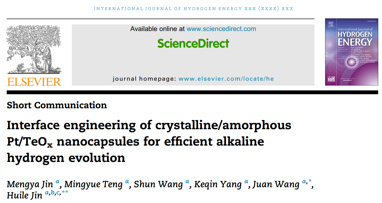 相关研究以“Interface engineering of crystalline/amorphous Pt/TeOx nanocapsules for efficient alkaline hydrogen evolution”为题发表在国际期刊《International Journal of Hydrogen Energy》(SCI-2区, IF=7.139)上,LY体育·(国际)官方网站作为唯一通讯单位,我院2019级本科生金梦雅为第一作者,我院金辉乐教授、王娟副教授为本文通讯作者。
