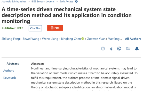 该论文题目为“A time-series driven mechanical system state description method and its application in condition monitoring”,我校机电工程学院21级智能制造专业学生冯世亮、王泽伟、蒋文茜为共同第一作者,联合厦门大学、众泰汽车等单位共同署名,指导老师为该班班主任孙维方博士。论文提出了一种基于时域信号的系统描述方法并成功将其应用于滚动轴承、加工刀具状态监测等场景,为相关关键技术装备的运行维护和故障诊断提供了一条新的可能。