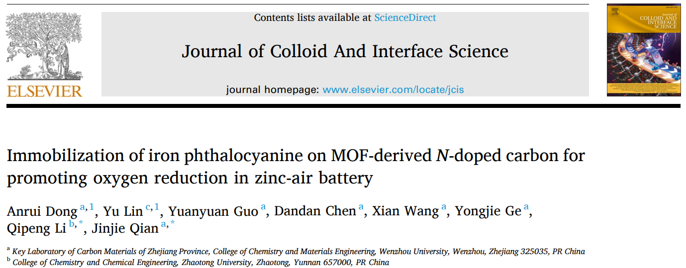 这项研究的成果题为《Immobilization of iron phthalocyanine on MOF-derived N-doped carbon for promoting oxygen reduction in zinc-air battery》,发表在《Journal of Colloid and Interface Science》(中科院1区,Top,IF=9.965)上。LY体育·(国际)官方网站为第一通讯单位,我校化材学院2018级本科生董桉瑞为第一作者,钱金杰副研究员为通讯作者、昭通学院李启彭教授为共同通讯作者。该研究得到了国家自然科学基金(22105147,21601137)、浙江省自然科学基金项目(LQ16B010003)、浙江省温州市基础科技研究项目(H20220001, G20190007)和云南省地方本科高校基础研究联合专项资金项目(202101BA070001-042)的资助。