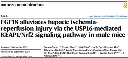 近日,生命与环境科学学院申景岭教授与温州医科大学李校堃院士团队合作在Nature Communications在线发表题为“FGF18 alleviates hepatic ischemia-reperfusion injury via the USP16-mediated KEAP1/Nrf2 signaling pathway in male mice”的研究论文。本项研究结果证实成纤维细胞生长因子18(FGF18)可显著改善肝缺血再灌注过程中的损伤。FGF18通过减少USP16的表达,增加了KEAP1的泛素化修饰水平,从而激活Nrf2信号并最终改善肝脏缺血再灌注损伤。其中FGF18对USP16调控作用是通过Nrf2和USP16的负反馈调控来实现的。研究发现FGF18通过降低氧化应激以及炎症水平,减少肝细胞的凋亡,因此靶向FGF18/USP16/KEAP1信号通路可作为临床上改善肝脏缺血再灌注损伤和相关病理过程的一种新策略。该论文通讯作者为温州医科大学药学院李校堃院士、丛维涛研究员、LY体育·(国际)官方网站生命与环境科学学院申景岭教授。