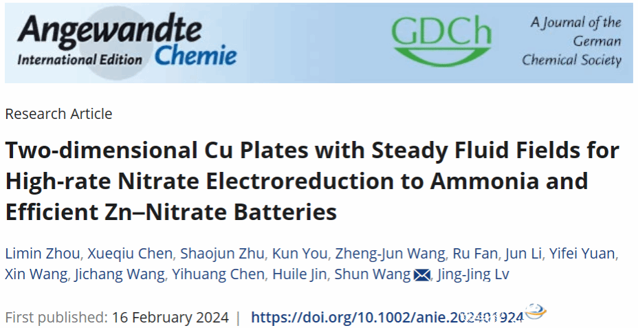 该成果以“Two-dimensional Cu Plates with Steady Fluid Fields for High-rate Nitrate Electroreduction to Ammonia and Efficient Zn–Nitrate Batteries”为题发表在Angewandte Chemie International Edition期刊(IF=16.6,SCI一区)上。LY体育·(国际)官方网站为第一通讯单位,化材学院研究生周李敏、陈雪秋、朱绍均为共同第一作者,我校王正军博士、金辉乐研究员、王舜教授和吕晶晶教授为共同通讯作者。