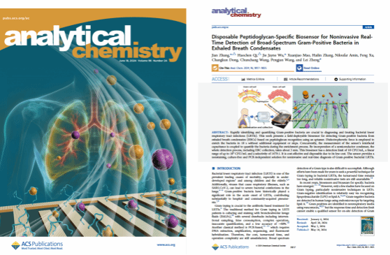 近日,我校电气与电子工程学院张鉴教授课题组以“Disposable Peptidoglycan-Specific Biosensor for Noninvasive Real-Time Detection of Broad-Spectrum Gram-Positive Bacteria in Exhaled Breath Condensates”为题在《Analytical Chemistry》发表论文,并被选为期刊正封面页(Front Cover)亮点报道。正封面页被用于报道ACS期刊所发表的重要工作,在期刊网站上展示为当期第一个封面,并与印刷版刊物同步发行。这是我校研究人员首次在该期刊发表正封面页论文,我校在该期刊发表的另一篇封面论文(Supplementary Cover)同样来自张鉴课题组的工作(Anal. Chem. 2022, 94, 6, 2812–2819)。