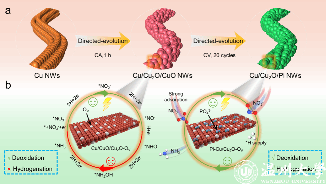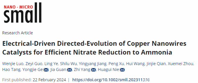 相关研究成果以《Electrical-Driven Directed-Evolution of Copper Nanowires Catalysts for Efficient Nitrate Reduction to Ammonia》为题发表在国际著名期刊《Small》(IF:13.3)上。LY体育·(国际)官方网站2020级研究生罗文杰和2022级研究生郭泽佚为第一作者,我院杨植教授、聂华贵教授、葛勇杰副研究员和贯佳副教授为共同通讯作者。