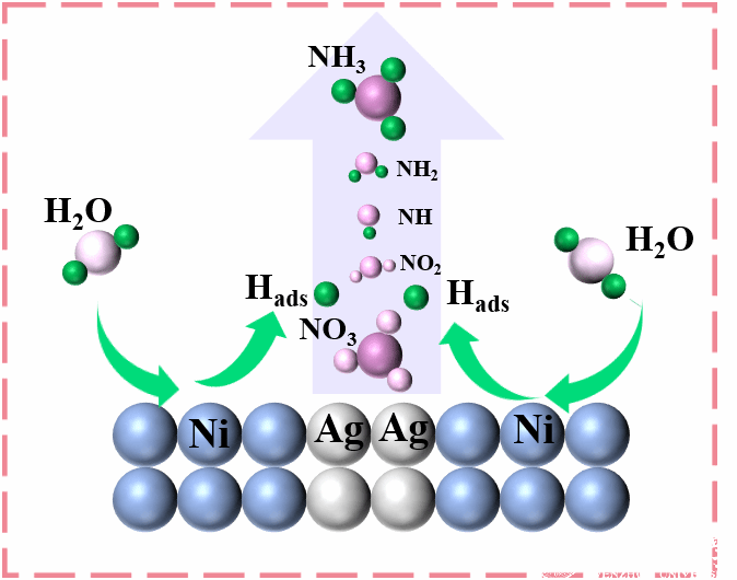 氨作为全球年产量最高的商用化学品之一,被广泛的应用在军事、化工、农业等领域。此外,氨还可以作为一种不含碳元素的氢能载体,相对于氢气而言具有更易液化(氨气液化:常压、239.9 K;氢气液化:10-15 MPa、50-70 K)、存储运输更为便利、安全性更高等优势。因此将氨作为一种新型能源进行推广对于实现“碳达峰、碳中和”的战略目标具有重要的意义,在未来的能源领域中氨具有很大的开发价值和应用前景。因此,发展高效的合成氨技术是十分必要的。在众多常温常压下合成氨的技术中,电催化酸盐合成氨(NO3RR)具有反应条件温和、电位可控、催化效率高、绿色环保以及受环境因素干扰小等优点,因此有望成为最有前途的替代Haber-Bosch工艺的方案。然而,NO3RR是一个复杂的8电子过程,过程中涉及到一系列的脱氧和加氢反应,从而降低了整体反应的动力学速率。为了提升NO3RR整体的反应速率,团队基于定向进化策略和反应路径的调控策略设计和开发了AgNi新型催化剂用于调控电催化硝酸盐合成氨的反应路径,实现低电位下高效合成氨。