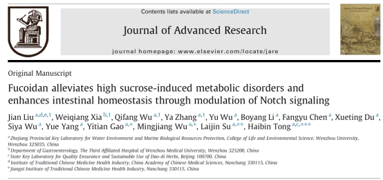 近日,我校生环学院佟海滨课题组揭示褐藻活性成分Fucoidan(岩藻聚糖硫酸酯)通过重塑肠道干细胞增殖与分化稳态改善代谢异常的分子机制,该研究成果Fucoidan alleviates high sucrose-induced metabolic disorders and enhances intestinal homeostasis through modulation of Notch signaling发表在《Journal of Advanced Research》(综合性期刊,1区Top,影响因子11.4)。