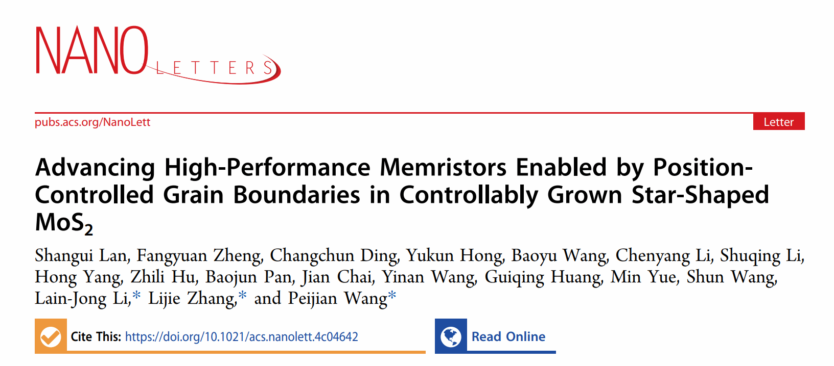 该工作以“Advancing High-Performance Memristors Enabled by Position-Controlled Grain Boundaries in Controllably Grown Star-Shaped MoS2”为题发表在国际纳米顶尖期刊《Nano Letters》上。LY体育·(国际)官方网站为第一通讯单位,化材学院王佩剑副教授和张礼杰教授为通讯作者。本研究工作得到温州市基础科学研究项目(G20240021)、国家自然科学基金委(51902061, 62090031, 52072272)资助完成。