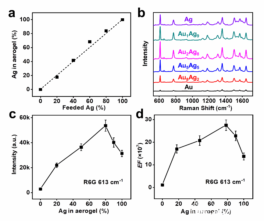图1 Au-Ag气凝胶的组成依赖SERS特性。(a)气凝胶中银的占比与投料比的关系图。(b) 532 nm激发波长下R6G在不同Ag占比气凝胶上的拉曼光谱。(c-d)拉曼强度(c)和EFs(d)随Ag在气凝胶中比例变化而变化的趋势图。