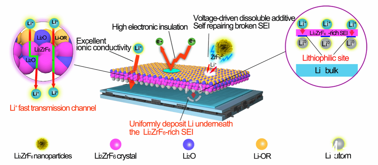 为解决以上问题,我校化材学院居治金特聘教授与华南理工大学严克友教授、中科院物理所李泓教授、浙江工业大学陶新永教授合作,首次提出了以m-Li2ZrF6纳米颗粒作为电压驱动型电解液添加剂的概念(图1)。研究表明,在电场的驱动下,m-Li2ZrF6颗粒向电解液中大量释放ZrF62-离子,然后通过自发反应在金属锂负极表面原位形成富含t-Li2ZrF6晶体的SEI。DFT计算显示t-Li2ZrF6晶体具有优异的离子电导率,能够在t-Li2ZrF6晶体内部和t-Li2ZrF6/Li2O所构成的晶界中,为Li+提供快速迁移的通道。基于t-Li2ZrF6组分独特的物理化学性质,富含t-Li2ZrF6的SEI具备了高离子电导率、高电子绝缘性和高电化学稳定性等理想型SEI必备的三大特征。此外,富含t-Li2ZrF6的SEI中t-Li2ZrF6晶体表面丰富的亲锂位点还能够促进金属锂的均匀沉积,抑制锂枝晶的产生。更重要的是凭借电压驱动解离释放ZrF62-功能离子特性,m-Li2ZrF6添加剂不仅能够改善传统添加剂在循环中被耗尽的缺陷,还能够通过ZrF62-离子及时修复破损的富含t-Li2ZrF6的SEI,为金属锂负极的界面稳定提供长期保护。基于上述优势,m-Li2ZrF6纳米添加剂能够使锂金属电池在超高面积载量和超大电流密度下稳定循环3000次,且拥有>80%的容量保持率。这项工作为金属锂负极界面保护研究提供了新的解决策略和材料,同时也为锂金属电池的实际商业化应用提供了可能。