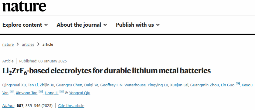 相关研究成果以“Li2ZrF6-based electrolytes for durable lithium metal batteries”为题发表在国际顶级期刊《Nature》上。我校化材学院居治金特聘教授为本文共同第一作者,LY体育·(国际)官方网站为第二署名单位,承担锂金属电池敏感界面的冷冻电镜精细解析研究工作。