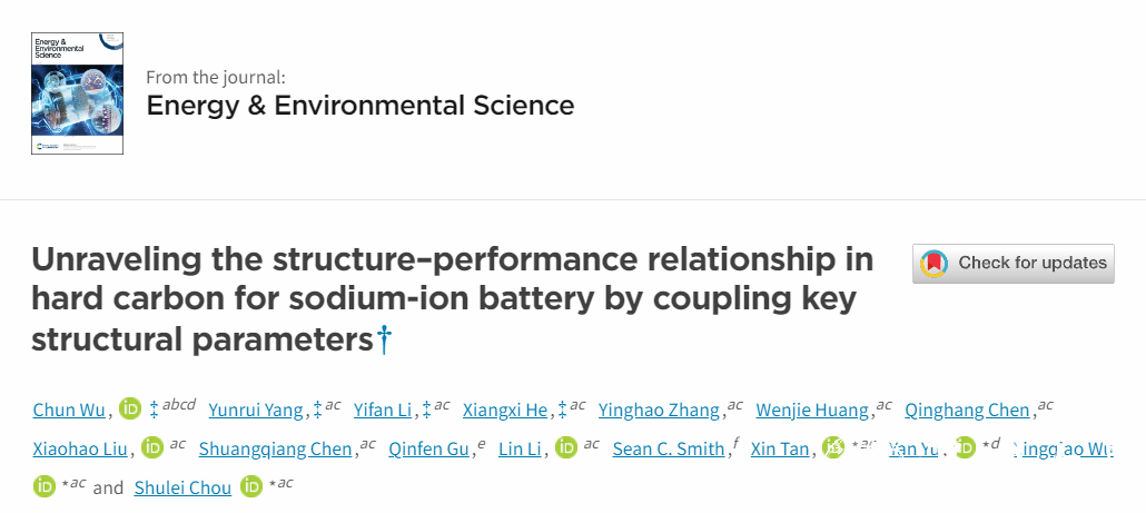 此项工作以Unraveling Structure-performance Relationship in Hard Carbon for Sodium-ion Battery by Coupling Key Structural Parameters为题发表在国际著名期刊Energy & Environmental Science上,LY体育·(国际)官方网站作为第一单位,侴术雷教授,谭歆教授,余彦教授,吴星樵老师为通讯作者。该研究工作由博士后吴春、2024届硕士毕业生杨云锐、2023级硕士研究生黎一凡、上海大学/LY体育·(国际)官方网站联培博士何祥喜完成。研究工作得到了国家自然科学基金,中国高端外国专家招聘计划,国家重点浙江省自然科学基金中国研发计划项目,安徽省科技计划项目,重点浙江省研发计划项目,温州自然科学基金等资助。