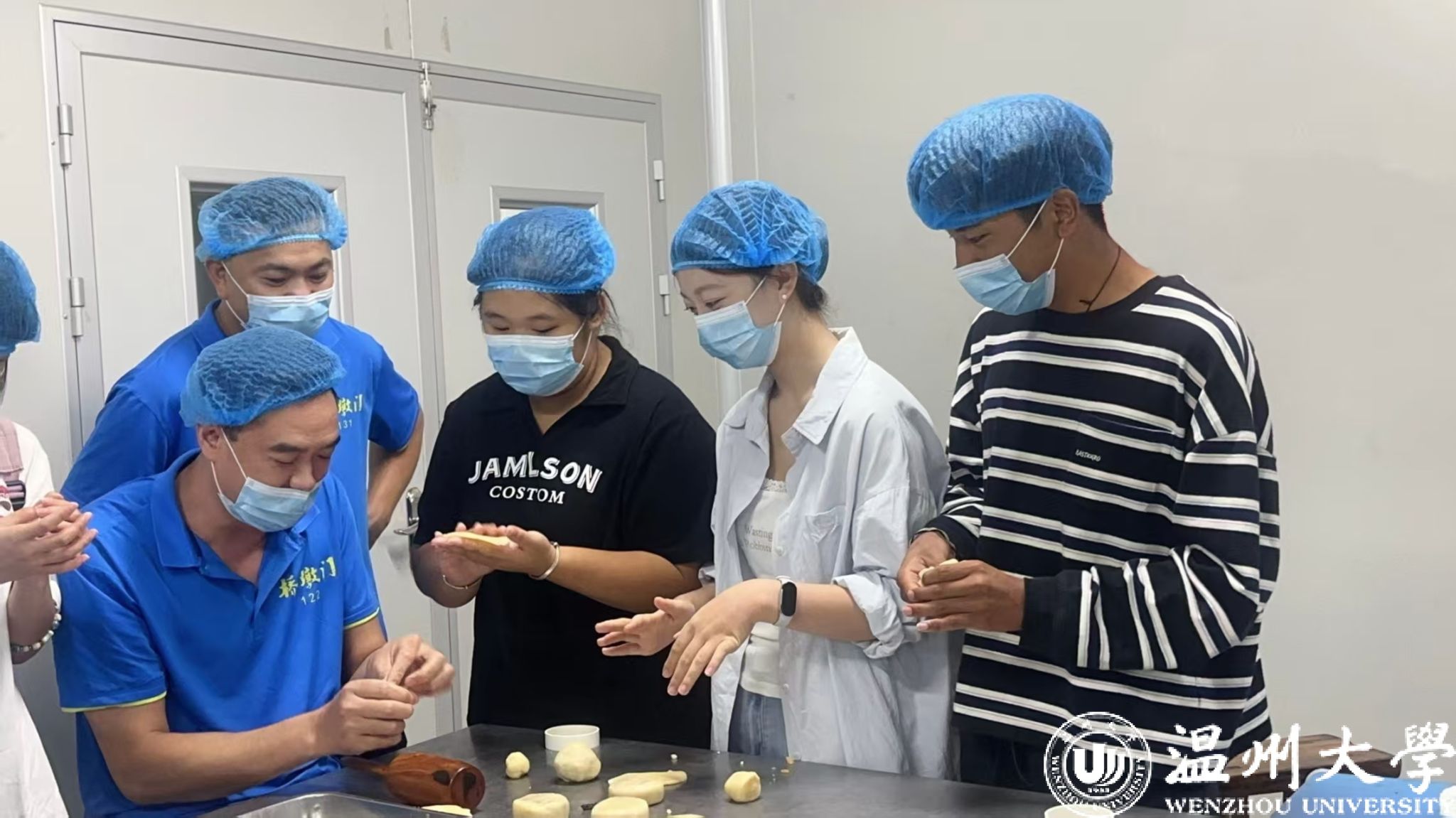 听完讲解,同学们迫不及待地进入月饼制作体验环节。操作台前,面团、馅料、模具整齐摆放,师傅手把手示范揉面的力度、包馅的技巧、印模的手法,“揉面要匀,让面团充满韧性;包馅要实,不漏不裂;印模要稳,花纹才清晰”,细致的指导让初次尝试的同学们迅速掌握要领。这些亲手制作的月饼,不仅承载着中秋团圆的寓意,更成为连接青年与温州本土文化的鲜活纽带,让大家在劳动中体会到温州人精益求精的工匠精神和浓厚的人文底蕴。