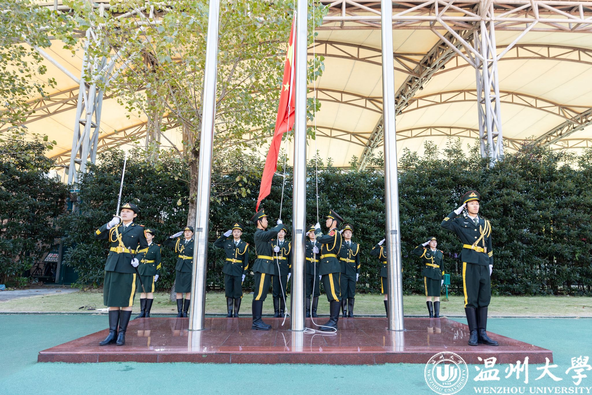 温大师生齐唱国歌,五星红旗冉冉升起。旗帜飘扬,激励着每一个人为着更高的荣誉、更远的目标而努力奋斗。