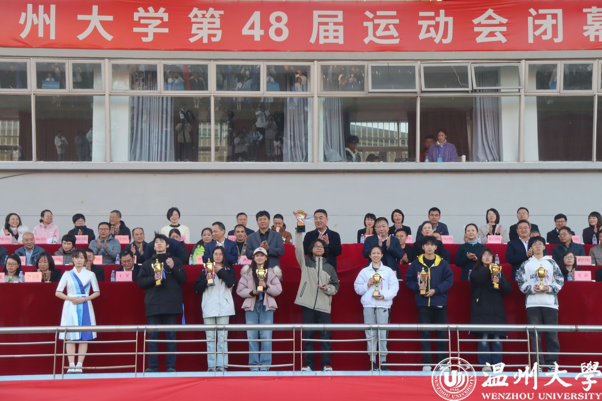 校长赵敏致闭幕辞。赵校长向取得优异成绩的团体和个人表示热烈的祝贺,并向为运动会成功举办做出贡献的各工作人员表达了诚挚的感谢。他指出,本届运动会的参赛者们诠释了“更快、更高、更强、更团结”的奥林匹克精神,不仅赛出了风格,赛出了水平,更用行动完美诠释了“敢为人先”的温大精神。在这次运动会中,许许多多的老师同学走向操场,感受拼搏精神、体会奋进力量——全校师生心往一处想、劲往一处使,将赛场变成了增进友谊、促进交流的舞台,绘就了文明、和谐、团结、奋进的校园画卷。赵敏衷心希望全校师生将赛场上所激发出的热情和斗志,转化为今后学习、工作和生活的强大动力,把集体荣誉感和奋进动力,融入学校发展的洪流。在“十五五”规划蓝图已全面展开的当下,将赛场上“迎难而上”的闯劲、“百折不挠”的韧劲、“众志成城”的拼劲,熔铸成改革创新、提质增效的具体行动,以“早半拍”的敏锐、“快一步”的担当,跑出当代大学生的最好成绩,以更加饱满的热情和更加扎实的行动,为加快推进建设浙江省高水平大学、争创“双一流”高校奋斗目标作出新的更大贡献!