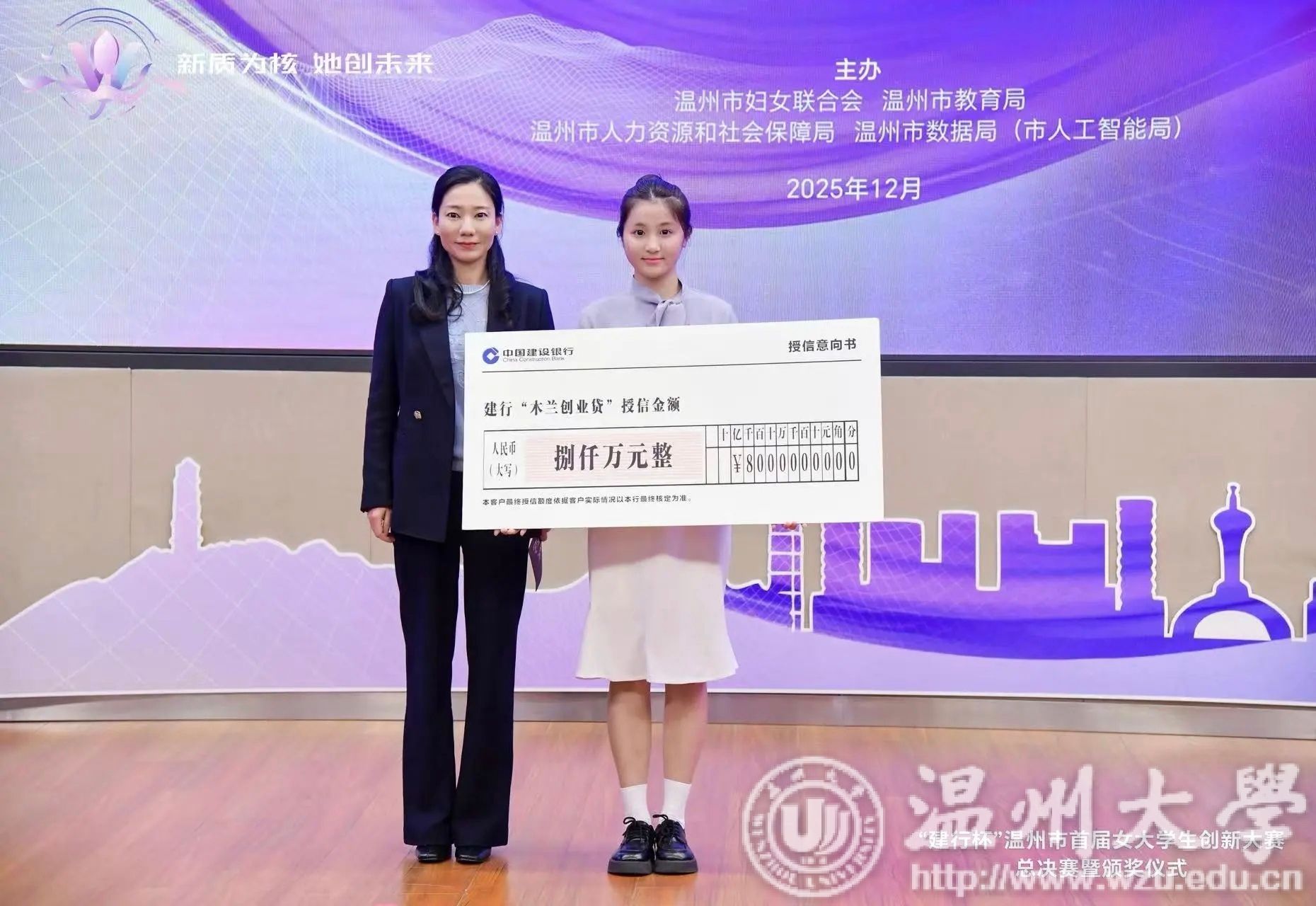 为更好地支持女大学生创新创业,建行温州分行特别推出“木兰创业贷”,并在活动现场举行了授信仪式,为全市创业女大学生提供 8000 万专项授信支持,以金融活水滋养创新之花。