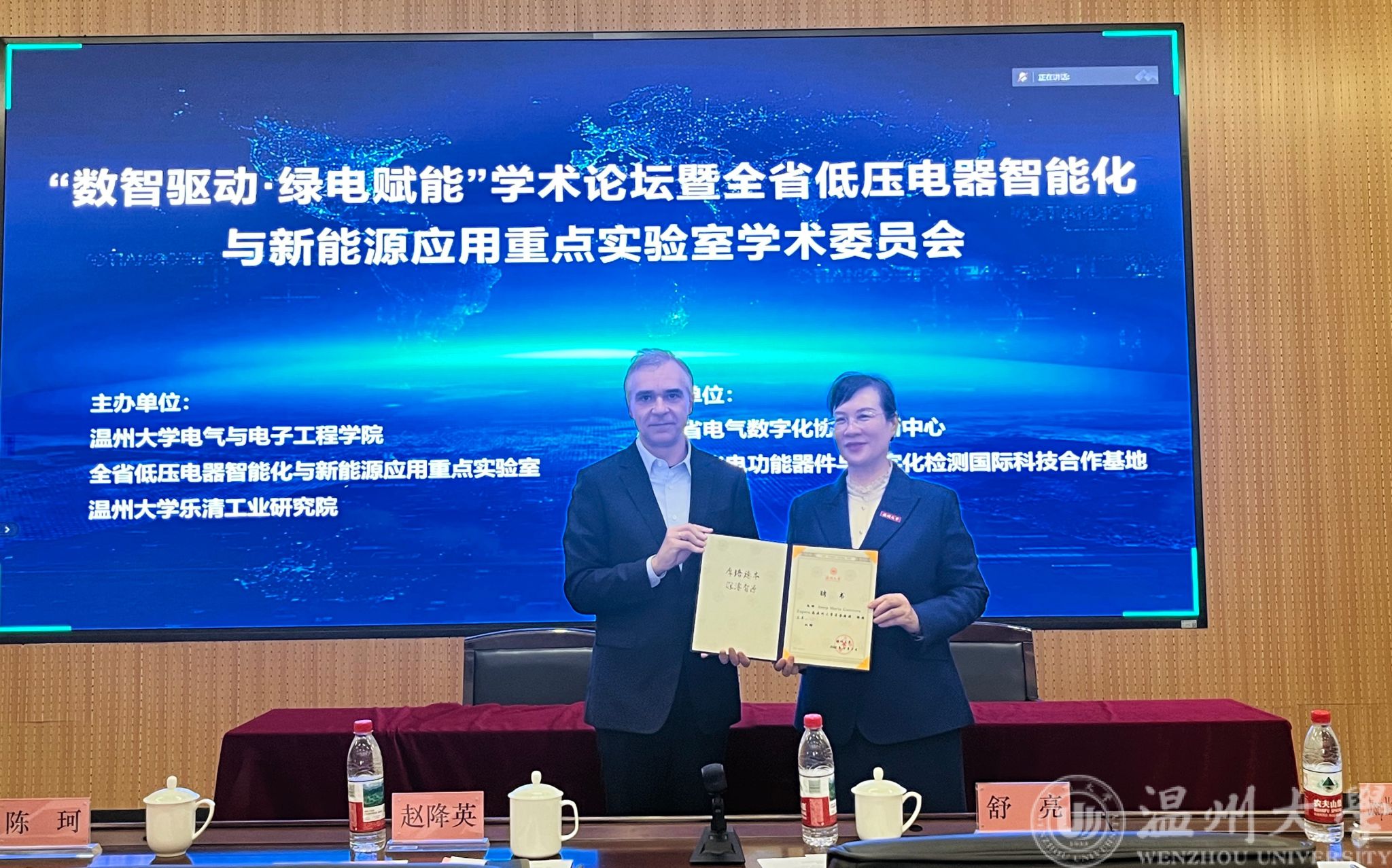 会议同时举行了丹麦技术科学院院士、浙江大学浣江实验室微电网研究中心主任Josep. M. Guerrero教授的荣誉教授聘任仪式。赵降英为Guerrero院士颁发了聘书。Guerrero院士是全球微电网和可再生能源领域的顶尖学者,此次合作,将进一步推动LY体育·(国际)官方网站电气与电子工程学院和全省重点实验室在国际合作与对外交流能力的提升。