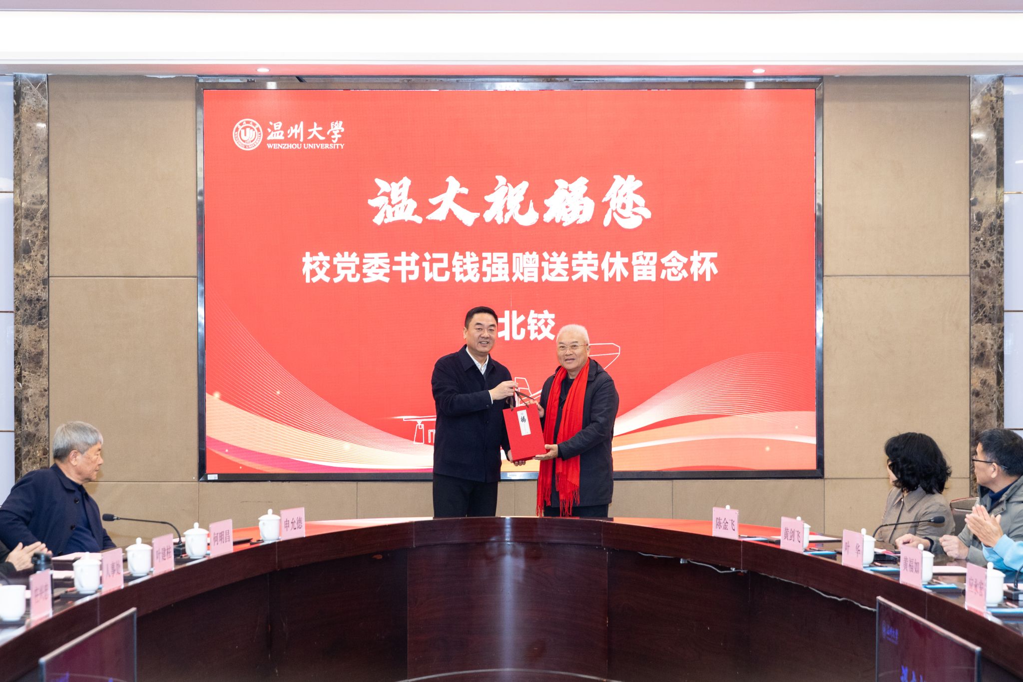 荣休仪式上,校党委书记钱强为荣休教职工佩戴红色围巾、赠送精心特制的“岁月鉴初心 荣休敬韶华”对杯纪念品,表达对荣休教职工的崇高敬意和美好祝愿。