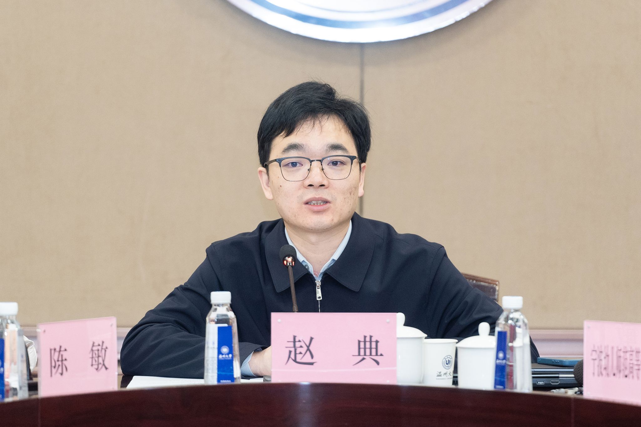 赵典作总结讲话。他系统回顾了“十四五”期间我省教师教育工作取得的显著成效,指出我省已构建起师范院校为主体、高水平综合大学参与的培养体系,在规模稳定、质量提升、模式创新及校地协同等方面成果丰硕,为全省基础教育发展提供了坚实支撑。面对当前的多重挑战,他强调,“十五五”新阶段必须主动应变、科学谋划,重点在五个方面协同推进:一是强化需求引领,动态优化师范生培养规模与层次结构;二是深化“人工智能+教师教育”融合,重塑未来教师核心能力素养;三是健全高校、政府与中小学深度协同机制,增强育人合力;四是延伸职后支持服务链条,构建教师全周期发展体系;五是推进综合改革试点,完善教师队伍治理体系。他表示,省教育厅将继续与各培养院校紧密协作,共同推动我省教师教育高质量发展,为全国教师队伍建设持续输出浙江经验。