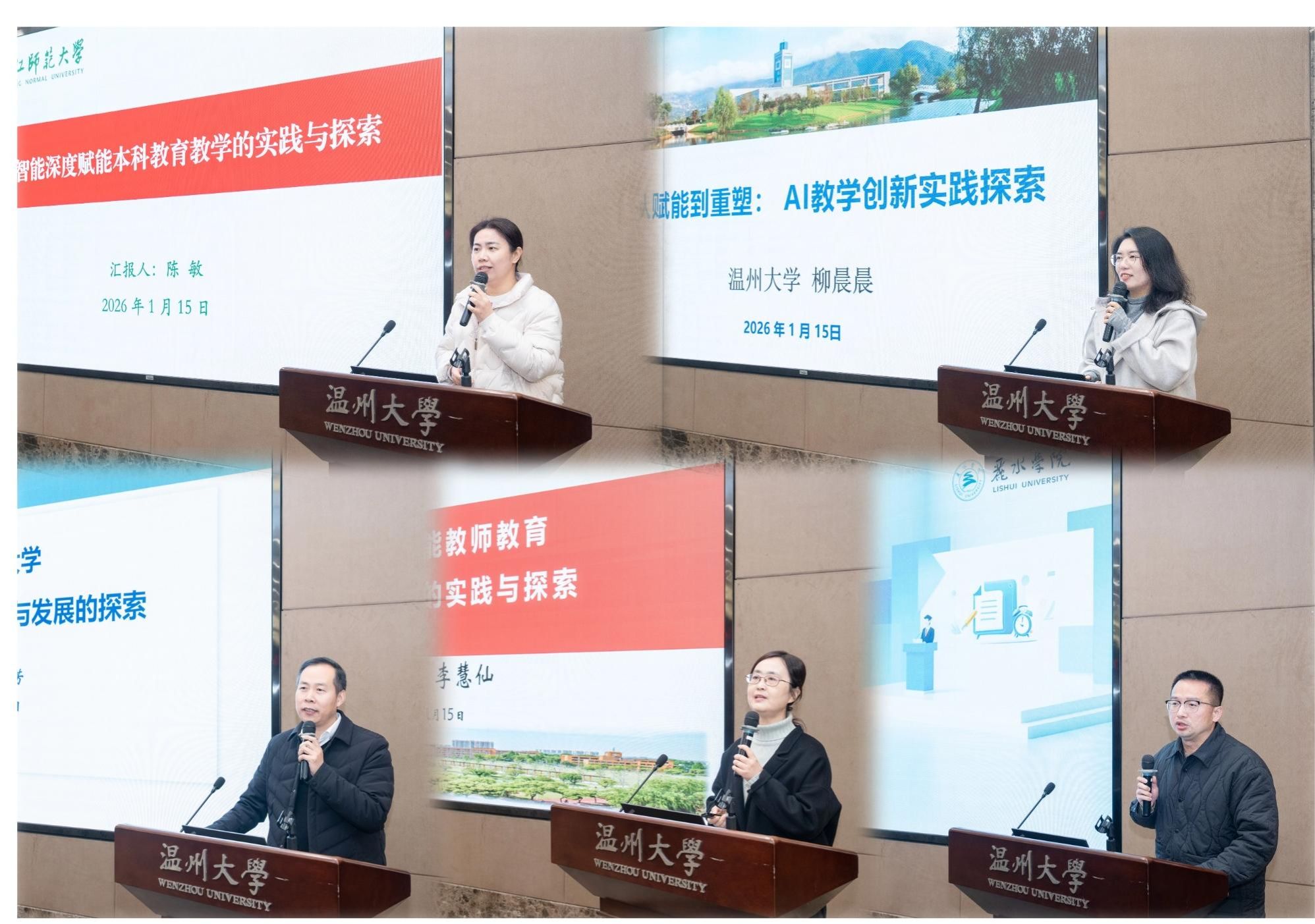 会上,我校与浙江师范大学、宁波大学、杭州师范大学、丽水学院等5所高校代表作主旨发言,分享了各自在人工智能赋能教师教育改革与发展的实践探索与系统规划。我校人工智能与未来教育研究中心执行主任柳晨晨从战略引领、机制创新、微观破局三个层面分享了AI赋能教育教学创新的实践探索和温大经验。浙江师范大学教务处处长陈敏介绍了其“五位一体”的系统行动方案;宁波大学教务处副处长李慧仙聚焦挑战,分享了其在微专业建设、课程群融合及智慧教学环境构建方面的实践;杭州师范大学教务处处长孙德芳以“挑战与探索”为主线,阐述了在专业调整与人工智能赋能双重背景下的改革举措;丽水学院教务处副处长洪千里则重点汇报了其构建“人工智能+教师教育”微专业群,培养复合型人才的具体思路。
