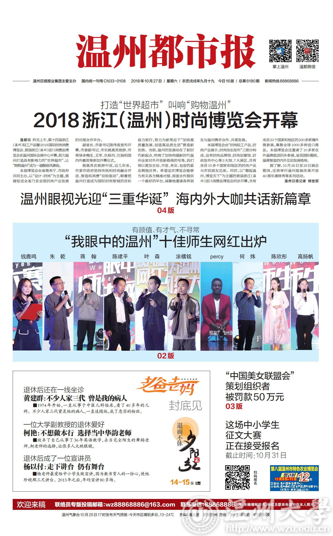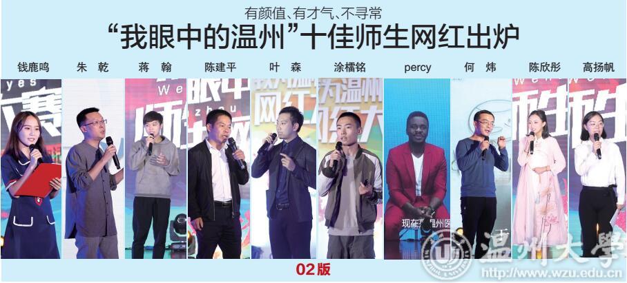 温都讯 昨天下午 2 时 30 分,“我眼中的温州”师生网红大赛暨网络文化进校园活动在LY体育·(国际)官方网站北校区举行。师生网红大赛以“我眼中的温州”为主题,是“我为温州代言”网红大赛的专场比赛之一。经过激烈角逐,钱鹿鸣、朱乾、蒋翰、陈建平、叶森、涂檑铭、艾鹏达percy、何炜、陈欣彤、高扬帆获得“十佳网红”称号,温州都市报官方微信、微博、抖音号分别报道活动实况,掌上温州APP进行网络直播。