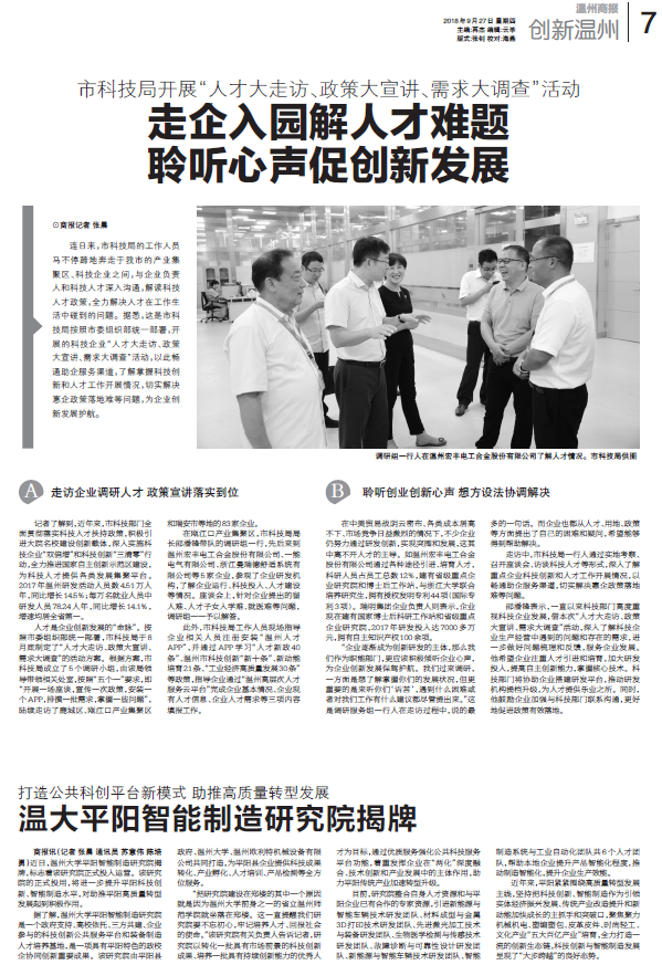 “把研究院建设在郑楼的其中一个原因就是因为LY体育·(国际)官方网站前身之一的省立温州师范学院就坐落在郑楼。这一直提醒我们研究院要不忘初心,牢记培养人才、回报社会的使命。”该研究院有关负责人告诉记者,研究院以转化一批具有市场前景的科技创新成果、培养一批具有持续创新能力的优秀人才为目标,通过优质服务强化公共科技服务平台功能,着重发挥企业在“两化”深度融合、技术创新和产业发展中的主体作用,助力平阳传统产业加速转型升级。