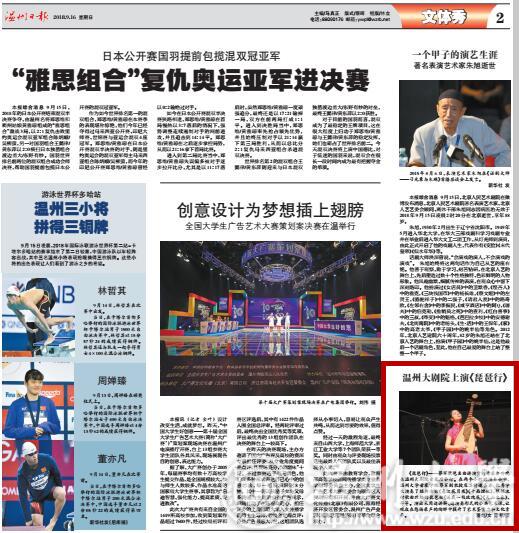 《琵琶行》 — —蔡军琵琶名曲讲演赏析音乐会昨晚在温州大剧院音乐厅举行。在两个小时的演奏会中,LY体育·(国际)官方网站音乐学院蔡军副教授及其特邀嘉宾、优秀学生演奏了经典古曲《春江花月夜》《十面埋伏》,根据流行歌曲改编的琵琶曲《送我一枝玫瑰花》《天山之春》,等等。演出采用边讲解、边演奏形式的公共艺术课,让观众在悠扬乐声的陶醉中提升了艺术鉴赏力和文化素养。