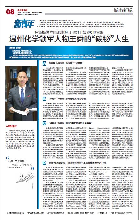 今年8 月当选英国皇家化学会会士,9 月牵头创办的国际学术刊物《Carbon Energy》(译为碳能源)正式发行,10 月入选“2019 年国家百千万人才工程”并获“有突出贡献中青年专家”荣誉称号……一年之内,LY体育·(国际)官方网站化学与材料工程学院院长王舜已悄然为温州化学界刷新了多个纪录,而这一切皆因他与“碳”结缘。