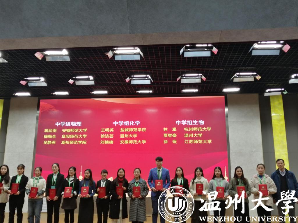 师范生教学基本功大赛分中学12个组、小学组、学前组进行比赛。其中中学组的比赛内容有教学设计、课件制作、即席讲演、上课与板书四个部分构成。我校入围的4名师范生分别参加了中学组的数学组、物理组、化学组和生物组的比赛。经过激烈的竞争,16化学(师范)专业的徐洁芸同学、16生物科学(师范)专业的贾智豪同学荣获一等奖,16数学与应用数学(师范)专业的李纯洁同学荣获二等奖,16物理学(师范)专业的李俊瑛同学荣获三等奖。